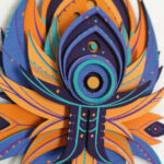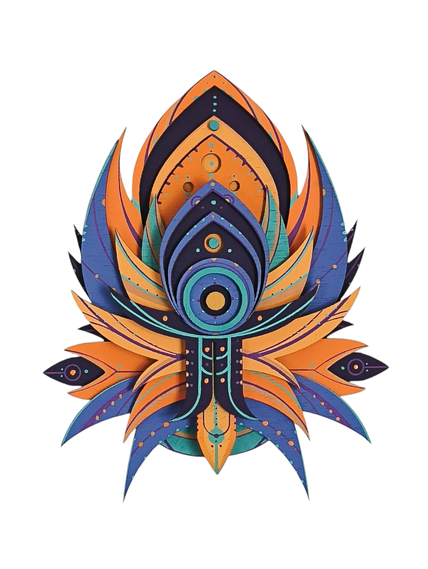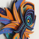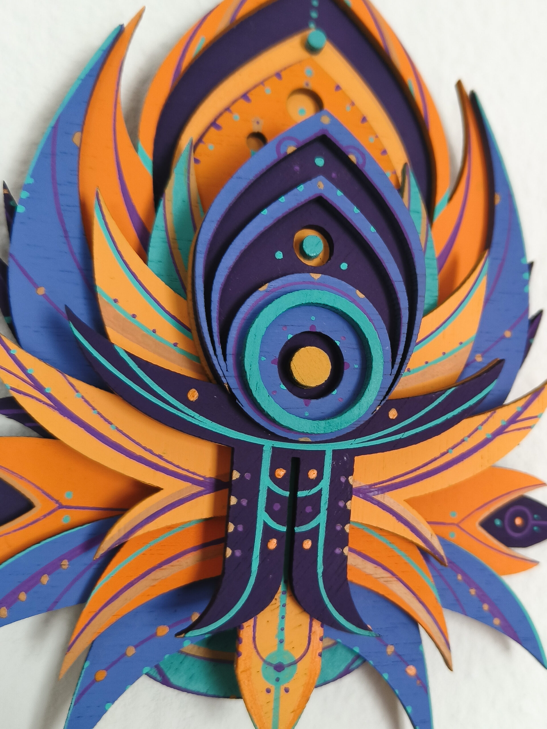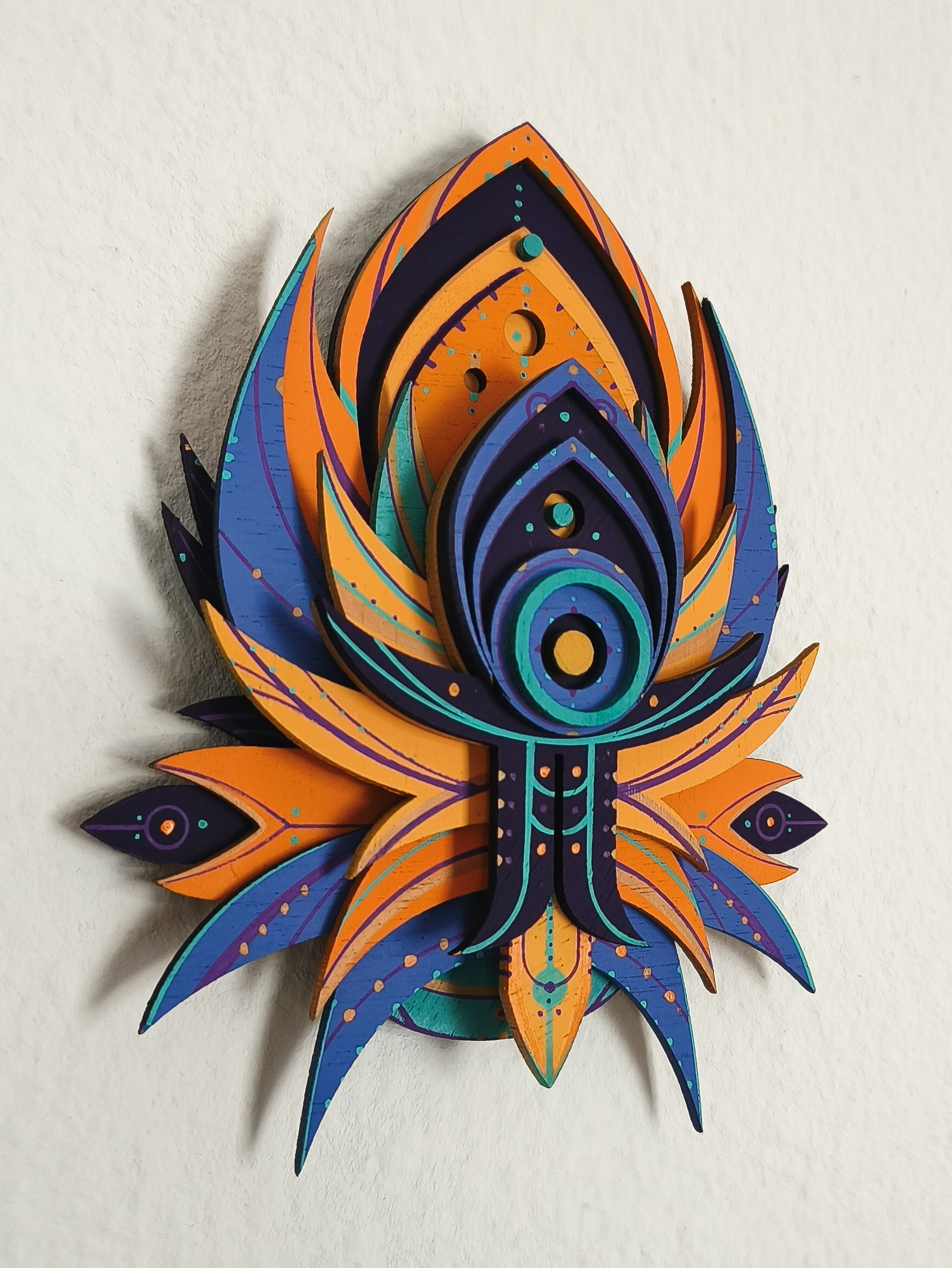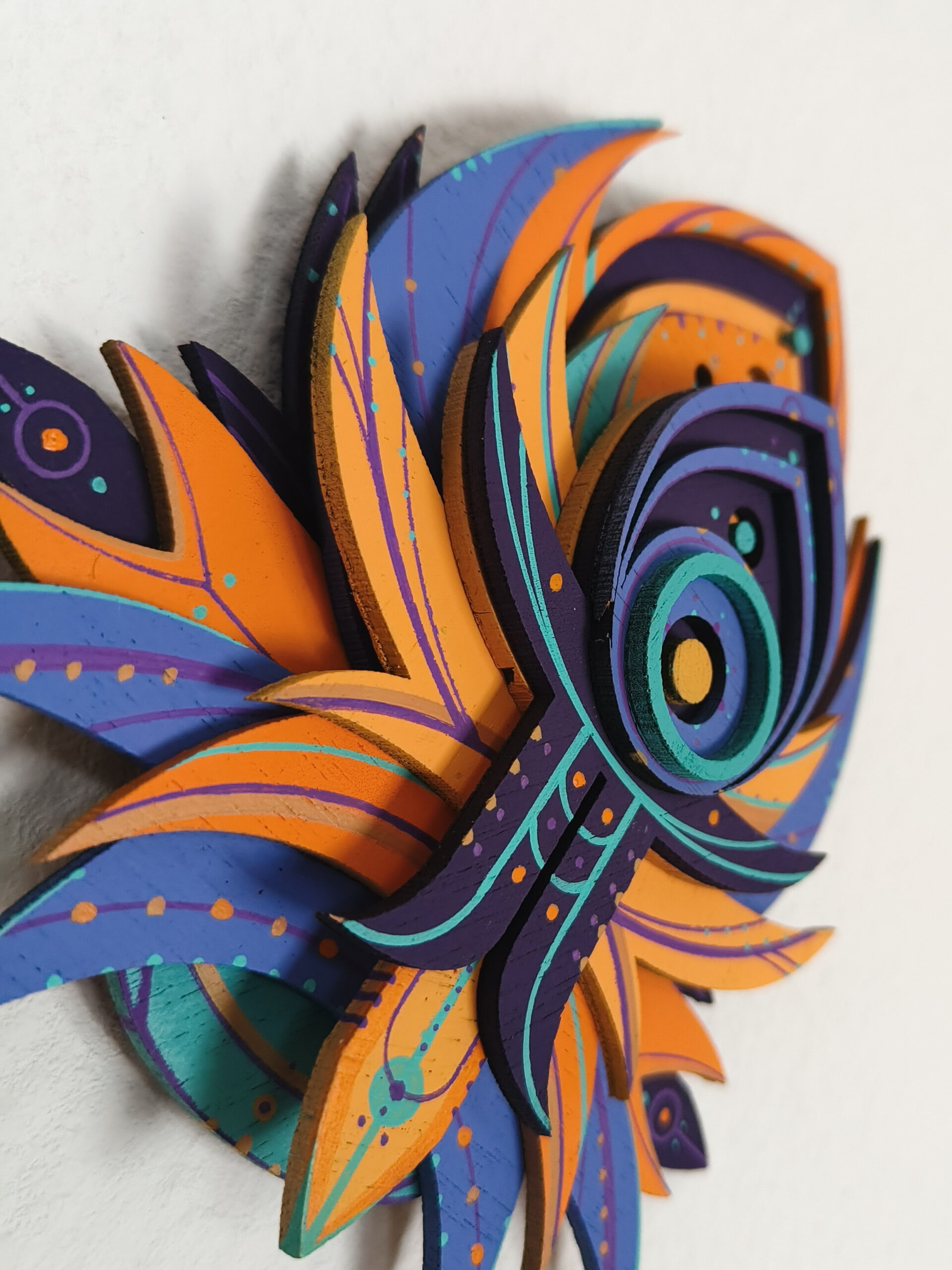 Esta escultura mural se define por el uso exclusivo de la línea curva, creando un lenguaje visual fluido y orgánico. Desde la psicología de la forma, sus trazos suaves y envolventes se alejan de la rigidez de los ángulos rectos para evocar sensaciones de calma, movimiento continuo y conexión con la naturaleza. Se trata de una obra de pequeño tamaño que, sin embargo, cobra un volumen notable gracias a la superposición de nueve capas de madera. Esta construcción genera un relieve profundo donde las formas parecen crecer desde el centro hacia el exterior, y donde la luz crea un juego de sombras que acentúa la tridimensionalidad de la pieza.
